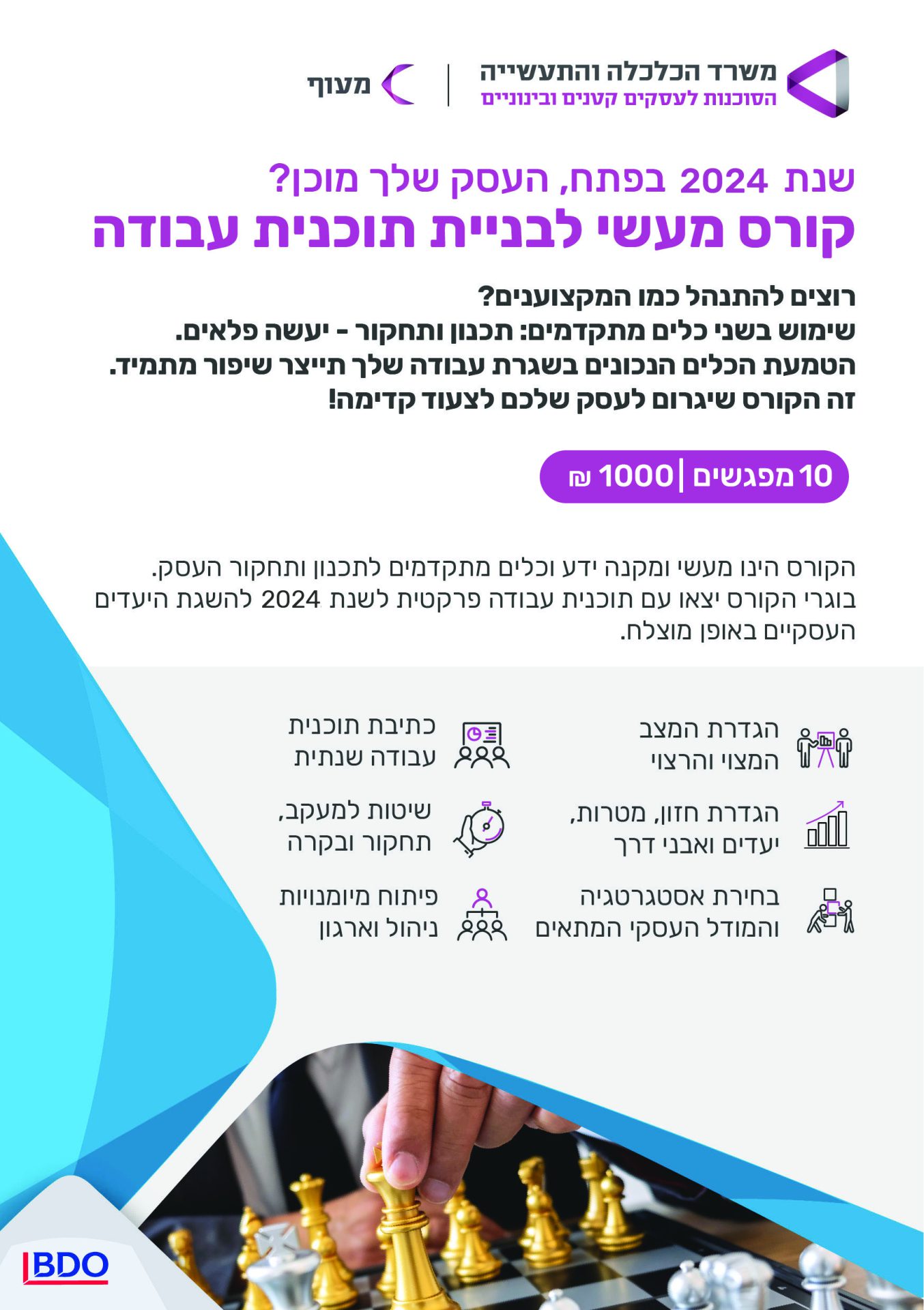 בוגרי הקורס יצאו עם תוכנית עבודה פרקטית לשנת 2024 להשגת היעדים העסקיים באופן מוצלח.