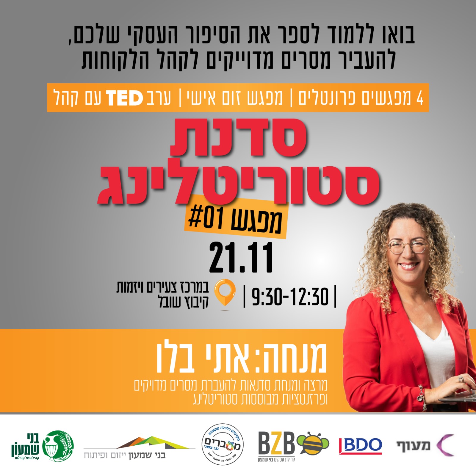 קהילת BZB בשיתוף מעוף ב"ש ובהנחיית המומחית לסטוריטלינג אתי בלו שמחים להזמינכם לסדנה בת 4 מפגשים + מפגשי זום אישיים בהם תלמדו כיצד לספר את הסיפור שלכם ושל העסק,